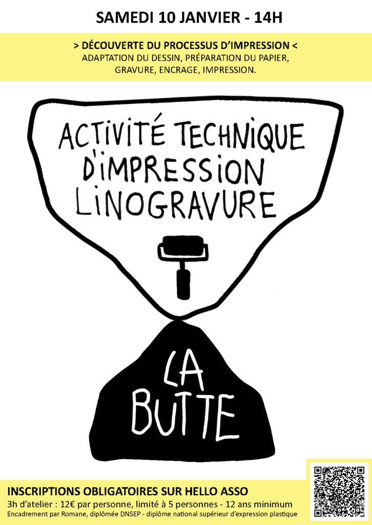 Pour lancer la dynamique, une activité technique de linogravure sera animée le samedi 10 janvier par Romane, diplômée DNSEP (diplôme national supérieur d’expression plastique). Les places sont limitées à 5, et attention, l’inscription sur helloasso est obligatoire !